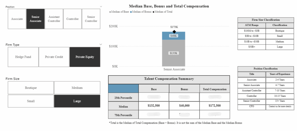 These definitions help standardize compensation comparisons across firms and ensure clarity when benchmarking your career level. In the preview above, you will see the two roles defined generally as Senior Associate: 4 to 7 years of experience & Controller: 10 to 15 years of experience. In the dashboard for members, you will see various other titles, including but not limited to: Associate, Assistant Controller, Senior Controller, etc.